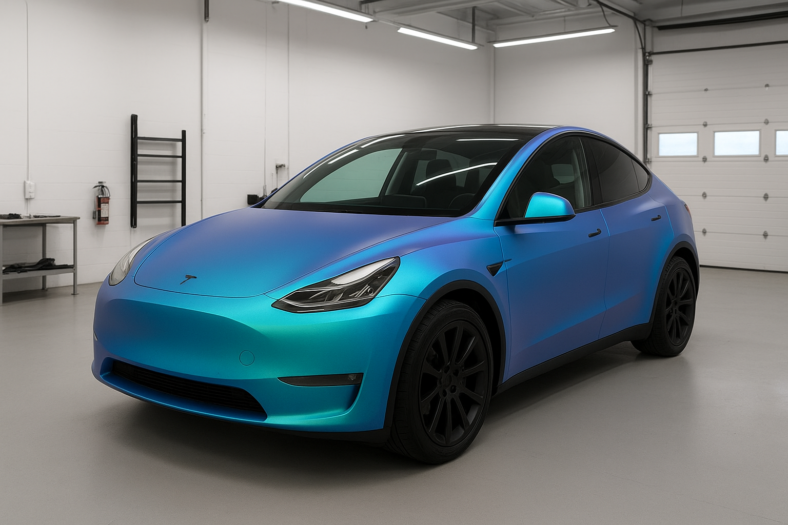 Kijk eens naar deze adembenemende Tesla Model Y, volledig gewrapt in een matte color-shift folie die verandert van blauw naar turquoise afhankelijk van het licht. π