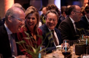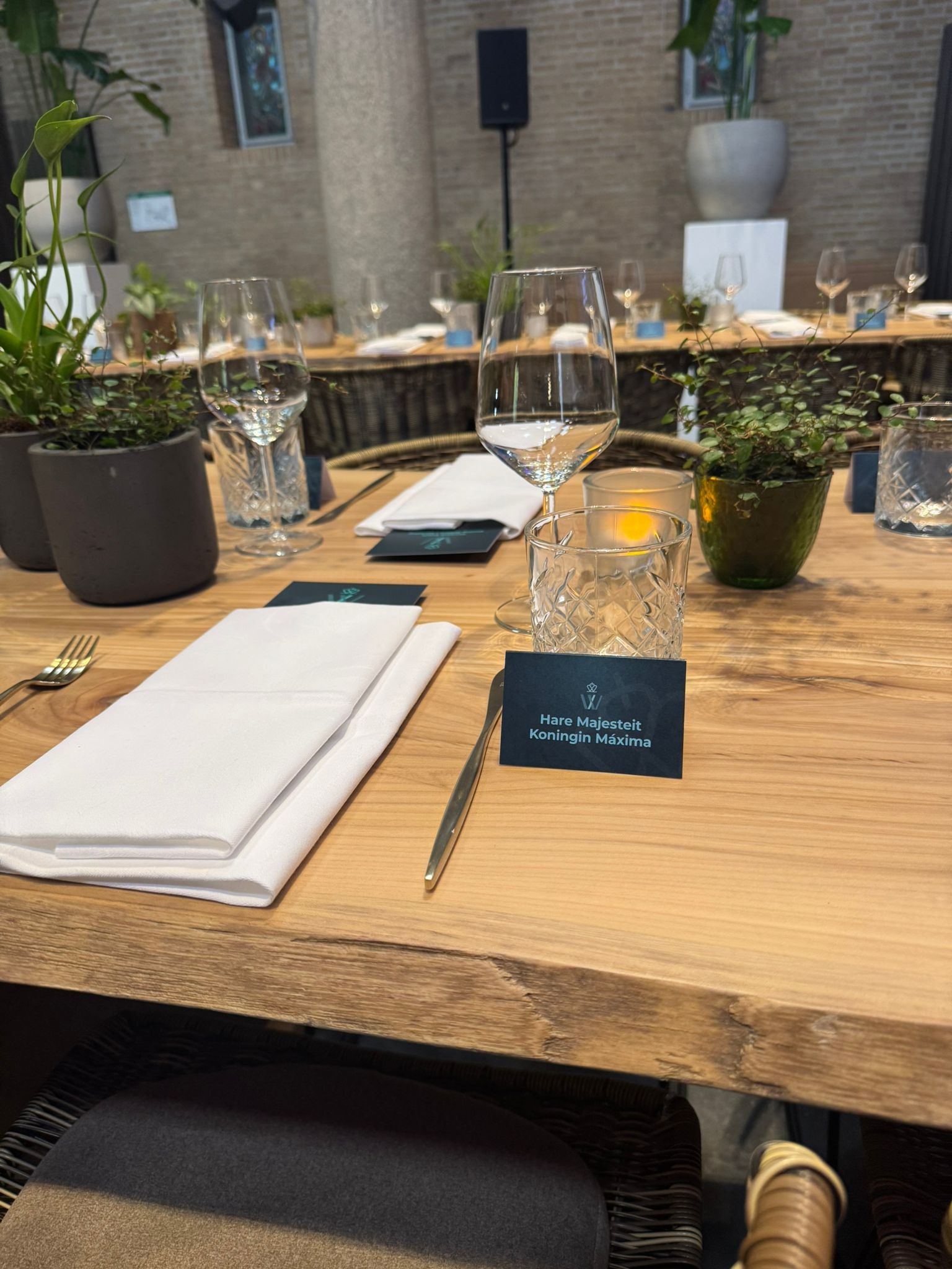 De buitenpilaren hebben wij omgetoverd in de gewenste huisstijl van het evenement, en niet te vergeten de bedrukte menukaarten en tot slot de seating cards.. met daarop Hare Majesteit Koningin Maxima.