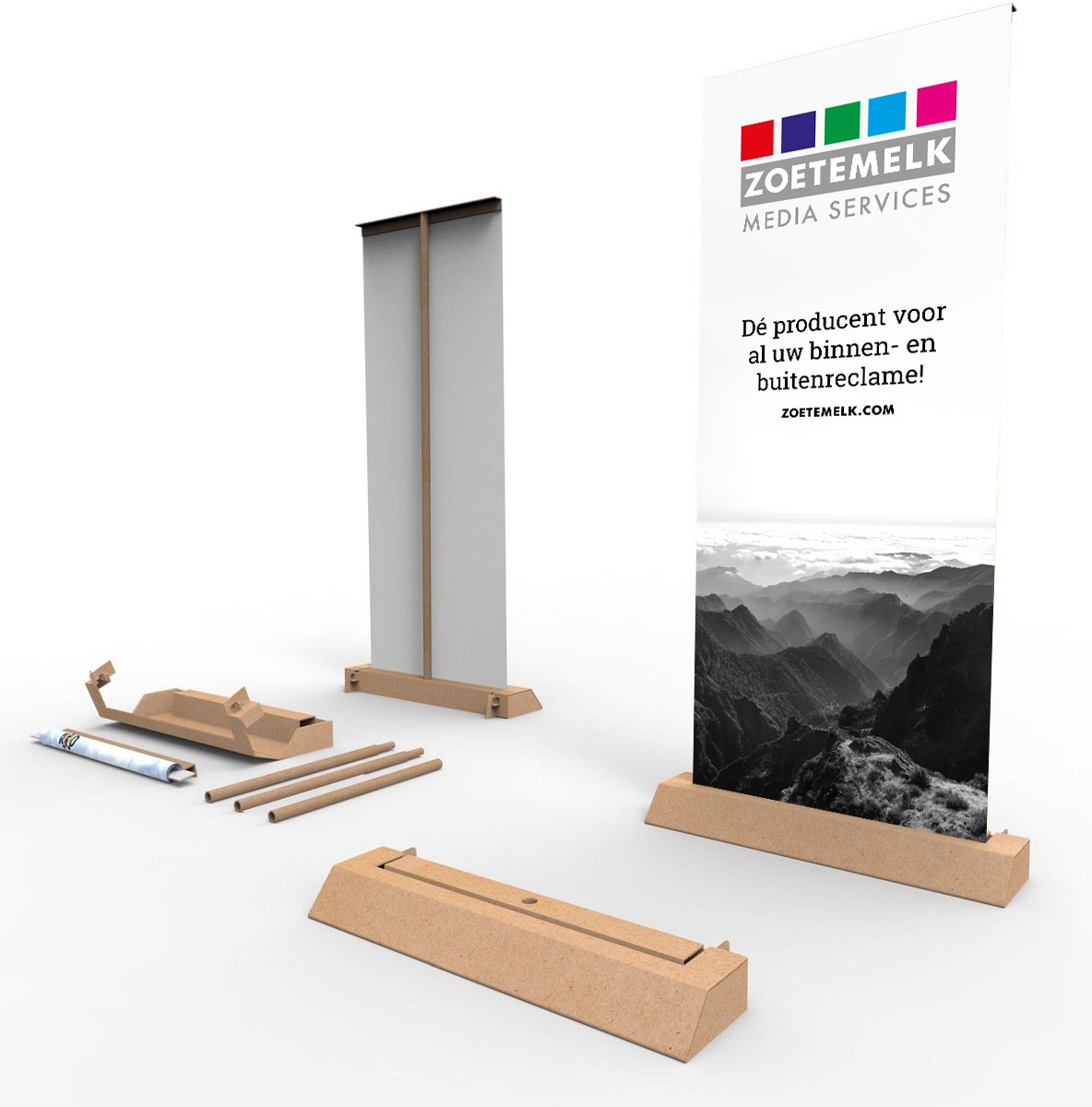 Vind jij het ook zo zonde om de aluminium cassette van je roll-up banner weg te moeten gooien na een beurs? Met onze kartonnen roll-up banners willen we jou (en de natuur) hiermee een handje helpen. Deze banners zijn gemaakt van 100% recyclebaar karton en papier waardoor je deze in zijn geheel in de papierbak kan gooien. De cassette is gemaakt van golfkarton en de banner van 200 g/m² fotopapier. Makkelijk te recyclen, beter voor het milieu en geen gedoe voor jou!