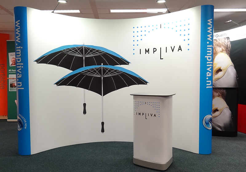 De gebogen pop-up wand is een gebogen presentatiewand met een print op flexibel PVC. Het grote voordeel van een beurswand? Het kost weinig tijd, er is geen beursbouwer nodig en de wand is gemakkelijk mee te nemen in de meegeleverde bedrukte kofferbalie.